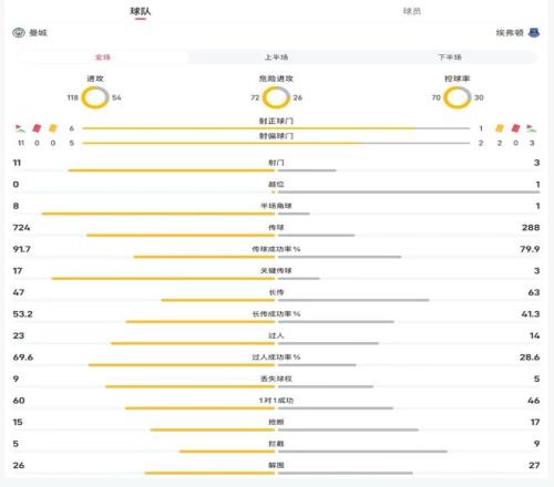 曼城vs埃弗顿全场主要数据: