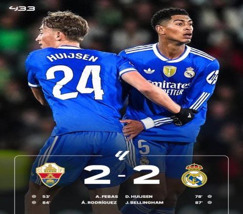 北京时间11月24日04:00,西甲联赛第13轮,皇家马德里客场挑战埃尔切。上半场双方均无建树。皇马半场0-0战平埃尔切。下半场,费巴斯首开纪录,赫伊森扳平,打进他在皇马的首个进球,随后阿尔瓦罗-罗德里格斯打进一球,贝林厄姆破门扳平比分。全场比赛结束,埃尔切2-2皇马,联赛两连平。目前仅1分优势领跑积分榜。
