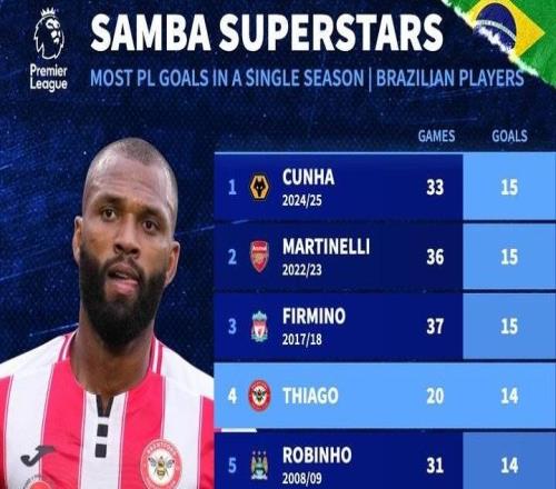 英超第21轮,布伦特福德主场对阵桑德兰,布伦特福德前锋伊戈尔-蒂亚戈上演梅开二度,以16球打破巴西球员单赛季英超最多进球纪录。此役主场对阵桑德兰,伊戈尔-蒂亚戈在比赛第30分钟