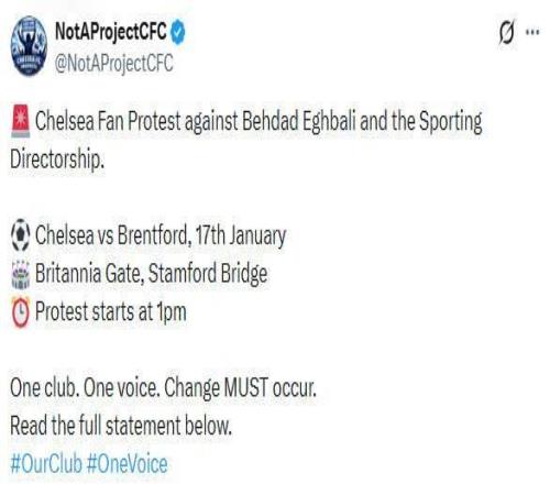 北京时间1月3日凌晨,切尔西球迷组织“Not a Project CFC”在社交媒体上发表动态,号召球迷在对阵布伦特福德的比赛中抗议俱乐部。早些时候,马雷斯卡在与俱乐部高层关系破裂后,在