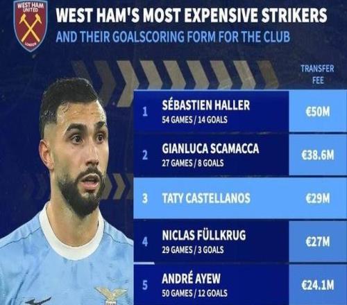 德转统计了西汉姆联队史引进花费最多的十名锋线球员,其中,阿莱以5000万欧元的转会费排名榜首,斯卡马卡第二,今年冬窗加盟球队的卡斯特利亚诺斯、巴勃罗分列第三、第六位。西汉姆