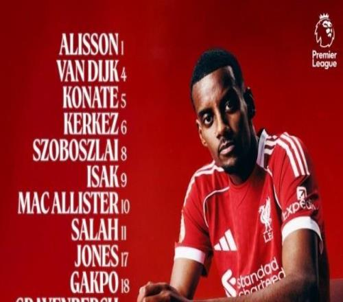 利物浦首发:伊萨克出战英超 11-22 21:51英超第12轮,利物浦主场迎战诺丁汉森林,赛前利物浦首发阵容已经出炉,具体名单如下: 利物浦首发:阿利松 / 柯蒂斯·琼斯、科纳特、范戴克、凯